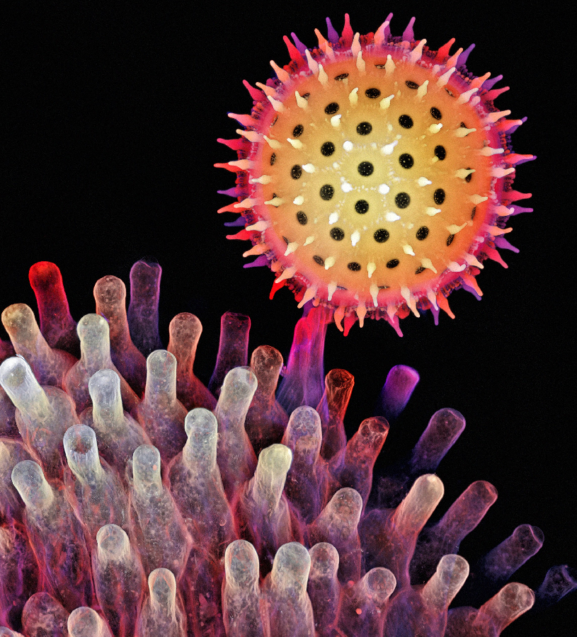 Чтобы получить это изображение, тычинки эдельвейса были отсканированы и реконструированы в трех видах с помощью лазерной сканирующей конфокальной микроскопии.
