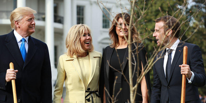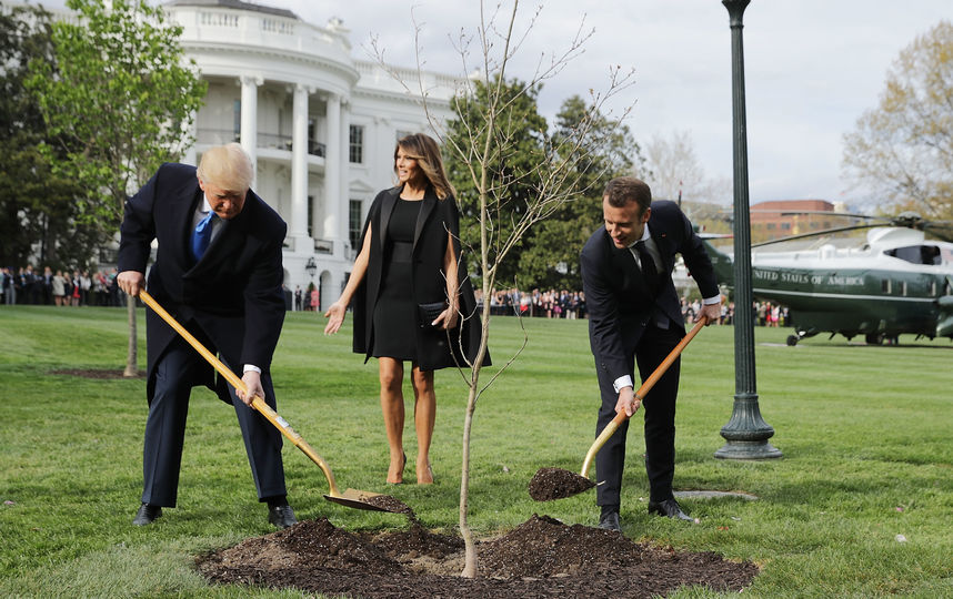 На лужайку у Белого дома Мелания Трамп вышла в черном коротком платье с летящей накидкой. Бриджит Макрон была в бледно-желтом наряде. Обе дамы в шутку руководили своими мужчинами, которые ловко установили дерево в ямку и присыпали землей. Президент США с женой и их гости явно были в приподнятом настроении и много улыбались.