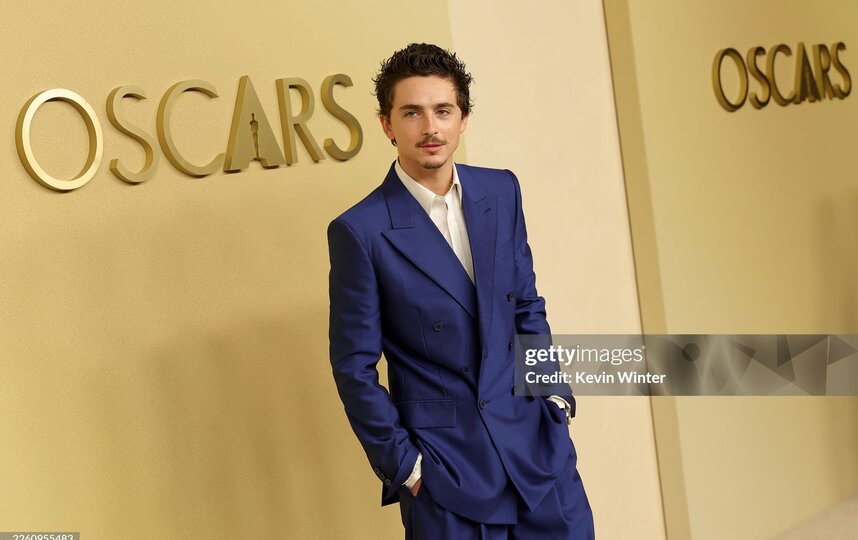 Тимоти Шаламе выбрал элегантный синий костюм. С именем актёра связана одна из главных интриг предстоящей церемонии. Кинокритики делают ставки, кто в итоге победит в номинации "Лучшая мужская роль" – Тимоти с его "Марти Великолепным" или всё-таки ДиКаприо с его работой в картине "Битва за битвой".