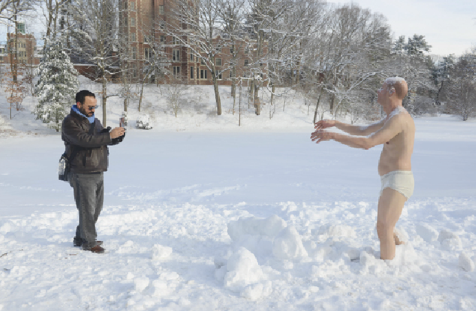 На этом снимке профессор Рашид Ааднани фотографирует статую «Лунатик» на кампусе женского Колледжа Уэллсли в штате Массачусетс. Эта сверхреалистичная статуя – часть выставки скульптора Тони Мателли. Многим натурализм пришёлся не по душе: студентки собирают петиции за то, чтобы её убрать.