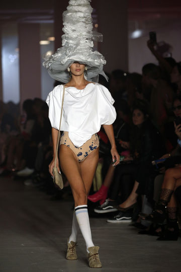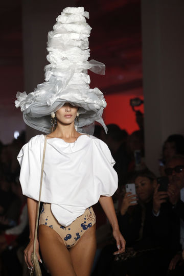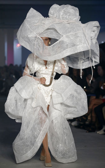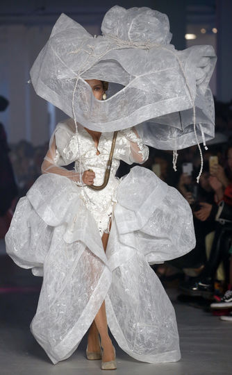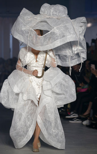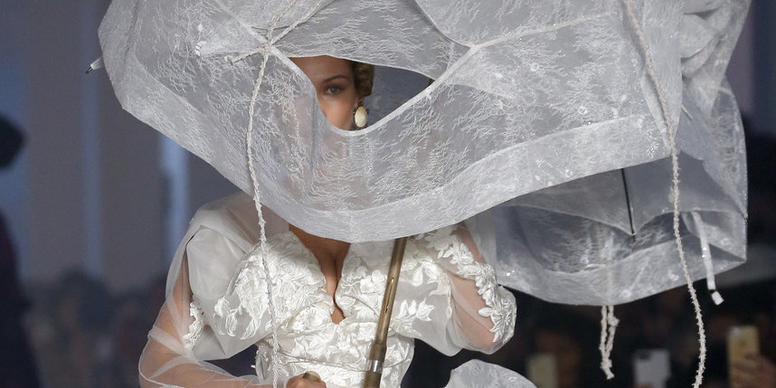 Белла Хадид появилась на дефиле в сногсшибательном свадебном платье с фантазийной юбкой и прозрачными кружевными рукавами. Объемный фасон замаскировал фигуру знаменитости. Однако от этого платье не потеряло свою соблазнительность. Глубокое декольте и полупрозрачная юбка сделали "невесту" Беллу невероятно притягательной. В руках она несла изящный зонтик, который дополнил ее образ.