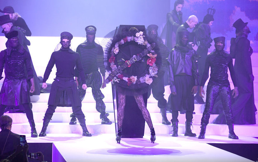 Началось шоу с настоящей провокации - на подиум мужчины в черном вынесли гроб, из которого вышла модель в белом платье. Видимо, этот образ связали с окончанием карьеры знаменитого модельера.