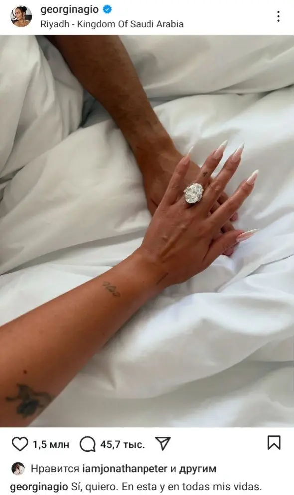 Об этом рассказала сама Джорджина в своих соцсетях, выложив фотографию с бриллиантовым кольцом и добавив подпись: "Да, люблю. В этой и всех остальных жизнях".
