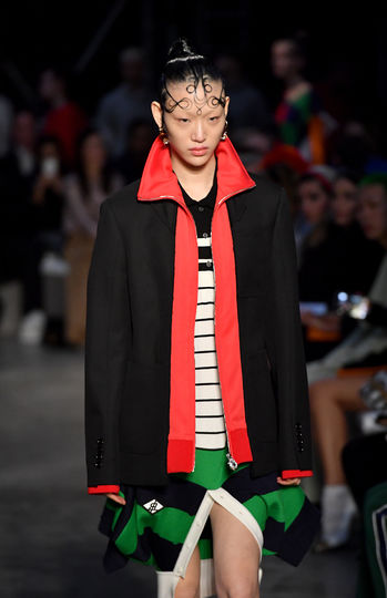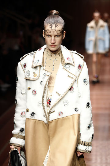 Одна из изюминок шоу Burberry - необычный мейк - необычные, нарисованные на лбу, завитки. С таким предстала перед зрителями Джиджи Хадид и другие модели.