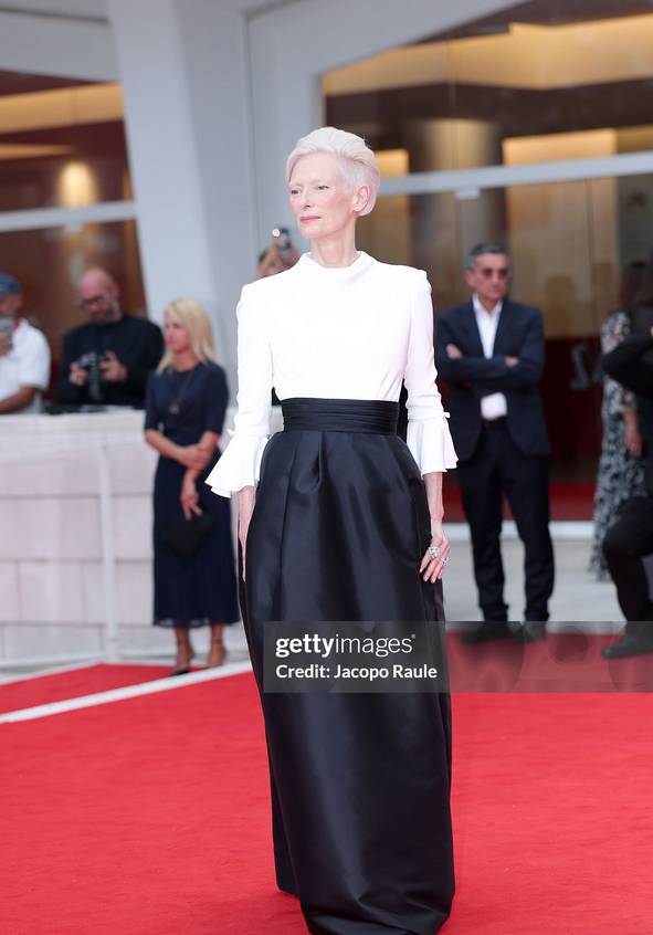 Нельзя не отметить с одной стороны простой, но определённо в стиле Тильды Суинтон наряд. Излюбленная и избитая многими чёрно-белая классика всегда будет эталоном. Британская аристократка появилась на ковровой дорожке в кастомном костюме от Chanel. Доподлинно неизвестно, приложил ли руку к этому образу новый креативный директор модного дома Матье Блази, но 64-летняя Тильда Суинтон в очередной раз стала иконой стиля.