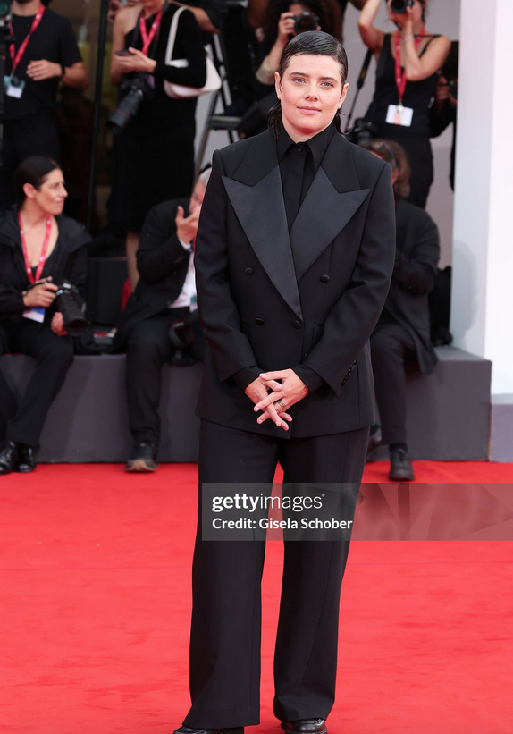 Также брючный наряд выбрала и продюсер Шарлотта Уэллс. Девушка отдала предпочтение total-black костюму с приталенным пиджаком.