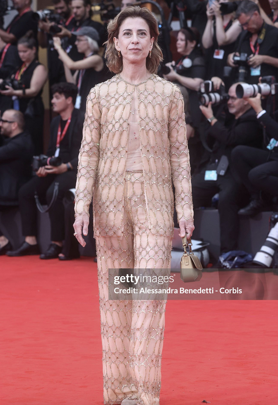 Актриса и продюсер Феранда Торрес появилась на красной дорожке в бежевом костюме от Armani Privé. Лёгкая телесная ткань обшита золотыми вставками и стразами.