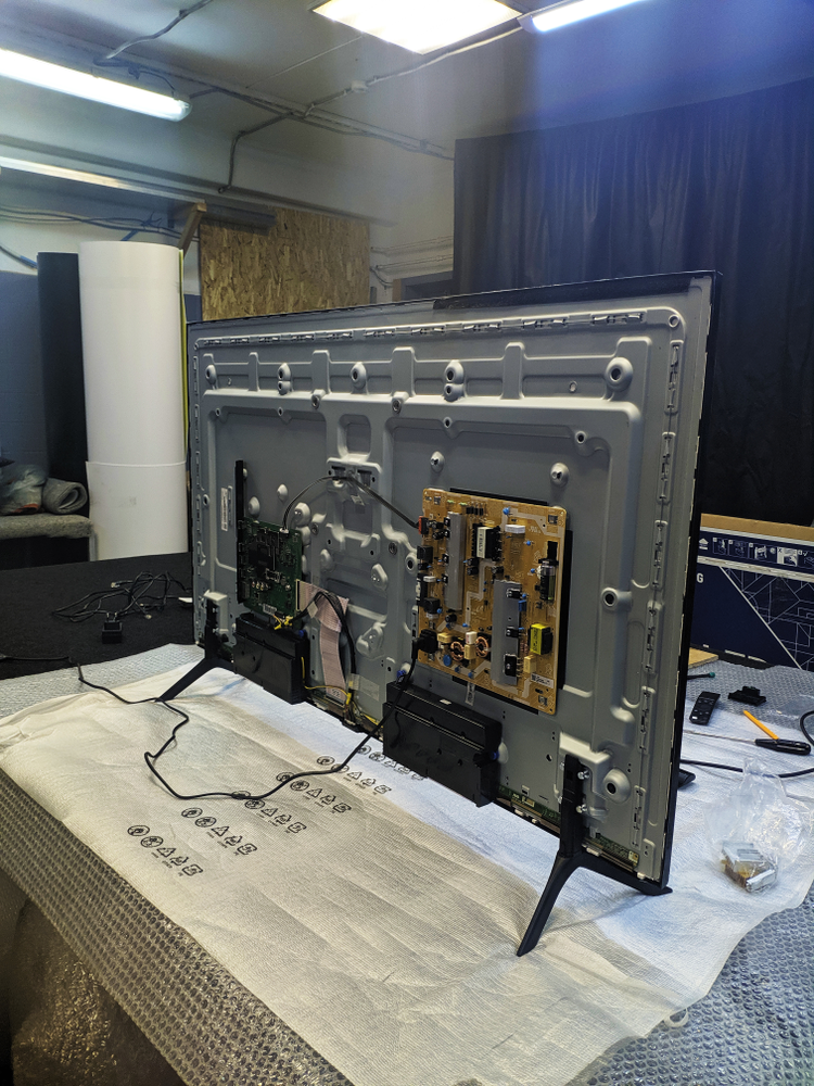 Мы очень аккуратно вскрыли ТВ, внедрили в него плату с Android TV на процессоре Amlogic S922XJ у которого на борту 4Gb оперативной памяти и 32Gb встроенной памяти, разрешение 4К, поддержка Auto Frame Reut, голосовое управление и все прелести Android.