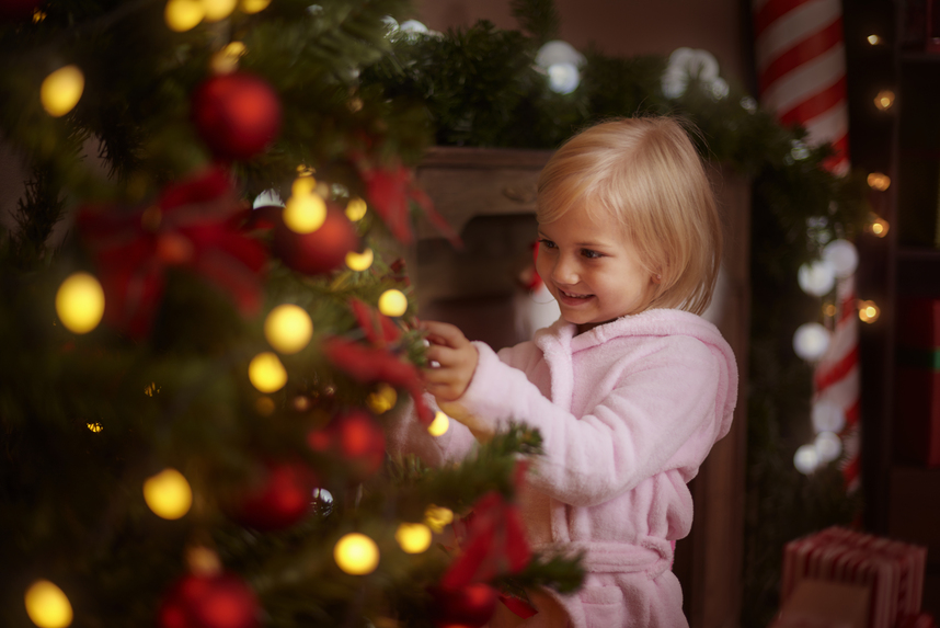 Для развития моторики предложите ребенку "специальные" украшения – крупные пластиковые кольца, связанные крючком снежинки, деревянные бусины. Выделите для них отдельную ветку на уровне его роста, объясняя правила игры.