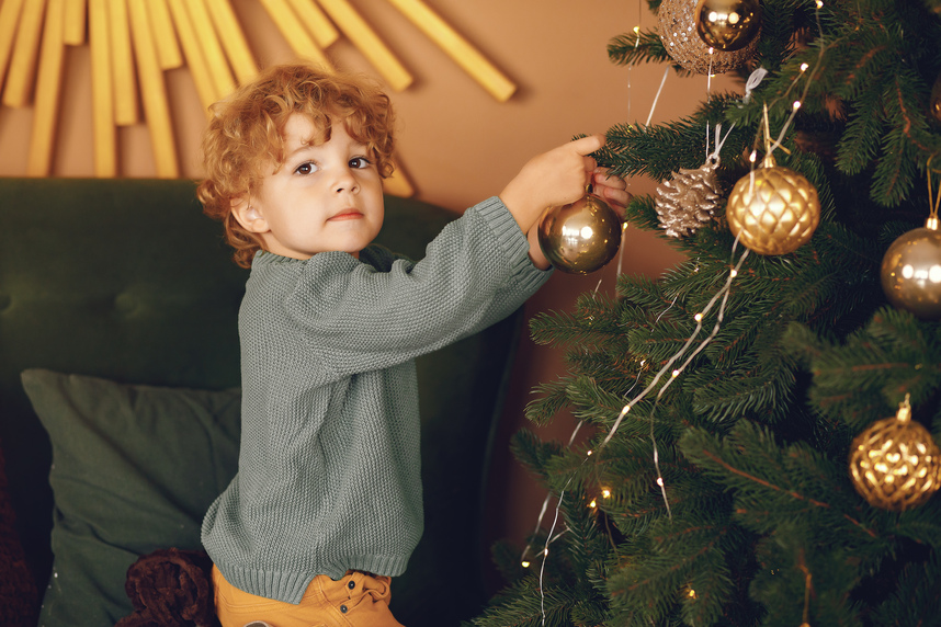 Нижние ветки оставьте пустыми или разместите там крупные трудносдвигаемые предметы: деревянные домики, мягкие игрушки, вязаные пледы. Это создаст буферную зону между ребенком и хрупкими украшениями.