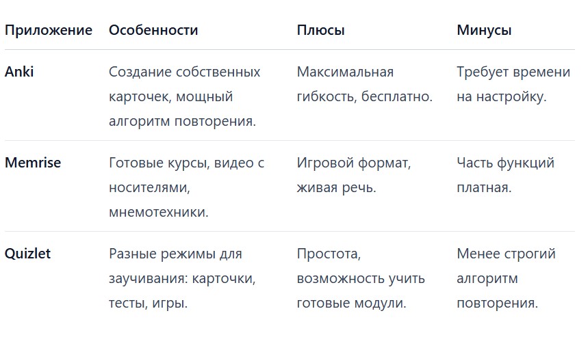Ответ: Для начинающих хорошо подходят Duolingo (для старта и игровой формы), Babbel (более структурированные уроки) и Memrise (для лексики). Для продвинутого заучивания слов нет ничего лучше Anki.
