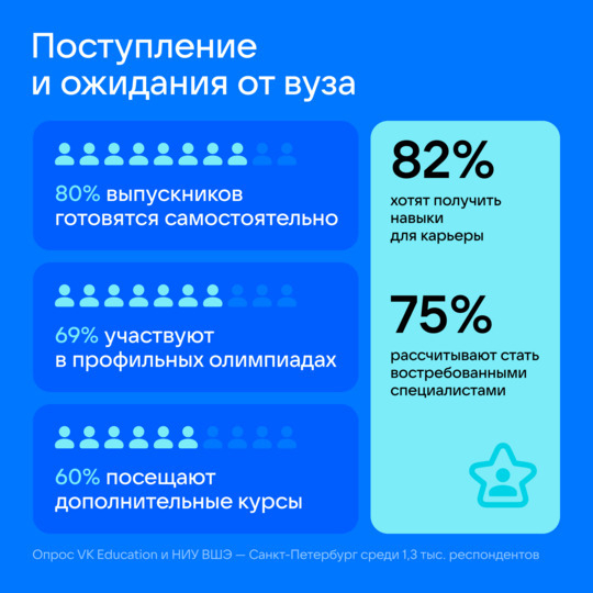 По данным опроса, 8 из 10 выпускников школ самостоятельно готовятся к поступлению, 69% – участвуют для этого в профильных олимпиадах, а 60% – учатся на дополнительных курсах. Большинство респондентов убеждены, что обучение в вузе должно дать им необходимые для карьеры навыки (82%) и по его итогам рассчитывают стать востребованными специалистами (75%).