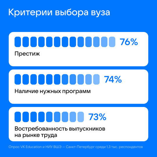 При выборе университета абитуриенты ориентируются на престиж учебного заведения (76%), наличие программ по выбранной специальности (74%) и востребованность выпускников на рынке труда (73%).