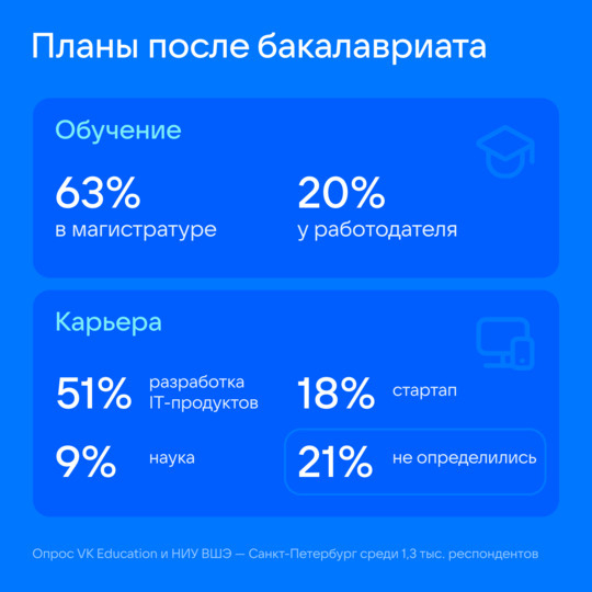 63% опрошенных рассчитывают продолжить обучение в магистратуре, а 20% – на стороне работодателя. После окончания обучения каждый второй респондент (51%) планирует разрабатывать IT-продукты и технологии, 18% – создать свой стартап, а 9% – заниматься наукой и исследованиями. Пятая часть опрошенных (21%) не определилась с карьерными планами до поступления.