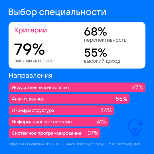 Будущие студенты выбирают специальность исходя из личного интереса к конкретной области (79%), перспективности направления (68%) и потенциально высокого дохода от работы в этом направлении (55%). Наиболее популярным IT-направлениями среди опрошенных абитуриентов стали искусственный интеллект (67%), анализ данных (55%), разработка IT-инфраструктуры (44%), разработка информационных систем (41%) и системное программирование (37%).