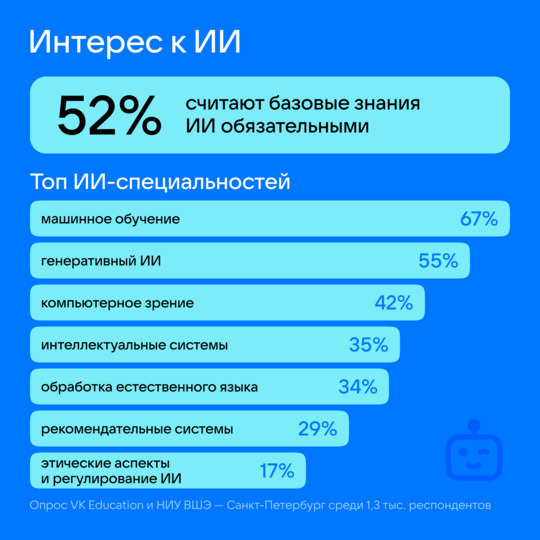 Более половины будущих IT-специалистов (52%) убеждены, что базовые знания в области ИИ необходимы вне зависимости от профиля подготовки. Среди конкретных ИИ-специальностей наиболее интересными абитуриенты назвали машинное обучение (67%), генеративный ИИ (55%), компьютерное зрение (42%), интеллектуальные системы (35%) и обработку естественного языка (34%). В число востребованных специализаций у поступающих также вошли рекомендательные системы (29%) и этические аспекты и регулирование ИИ (17%).