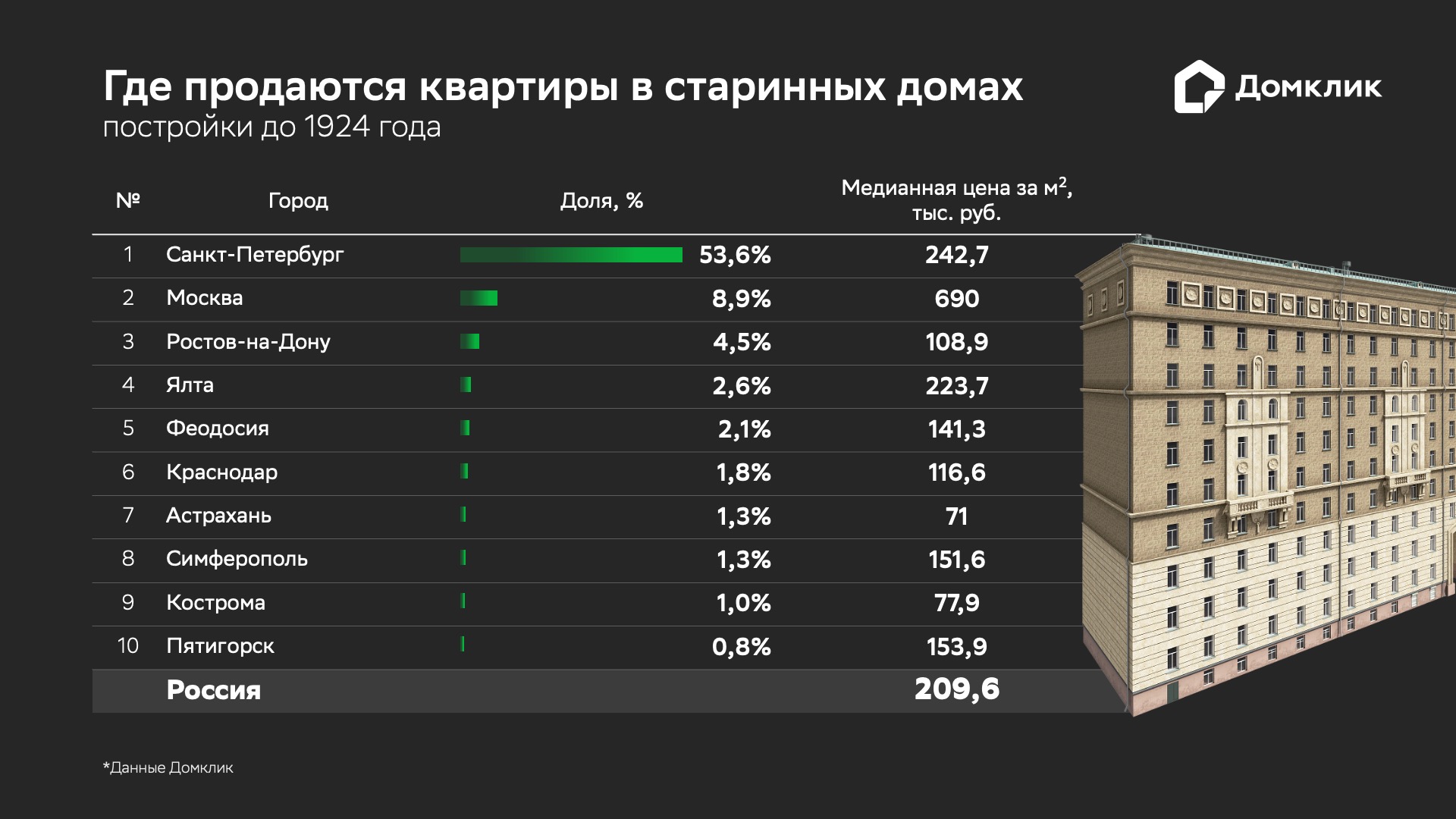 Тройку городов-лидеров по доле исторических квартир от общего числа таких квартир на витрине Домклик замыкает Ростов-на-Дону (4,5%). Стоимость квадратного метра квартиры в дореволюционных и домах раннего советского периода составляет около 109 тыс. руб.