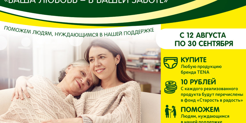 С 12 августа по 30 сентября в 870 торговых точках сети "Перекресток" по всей России пройдет акция "Ваша любовь – в вашей заботе". Для фонда помощи пожилым людям "Старость в радость" и компании Essity, международного производителя товаров для гигиены и здоровья, эта инициатива станет самой масштабной за всё время сотрудничества, начиная с 2017 года. Многократное расширение географии проведения акции делает её по-настоящему значимой, и даёт возможность жителям 45 регионов России сделать жизнь подопечных фонда немного комфортнее и счастливее.