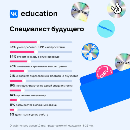 Согласно исследованию VK Education, молодые люди считают, что специалист будущего должен уметь работать с ИИ и нейросетями (36%), строить карьеру в этичной и уважительной среде (28%) и заниматься креативом, а не рутинными задачами (26%). 25% опрошенных зумеров выбирают дополнительное обучение ради карьерных перспектив, но чаще поводом пройти обучение становится пример друзей – об этом сообщили 28% респондентов. Зумеры ради успеха в карьере не готовы мириться с рутиной (30%), токсичной атмосферой (29%) и устаревшими подходами (26%).
