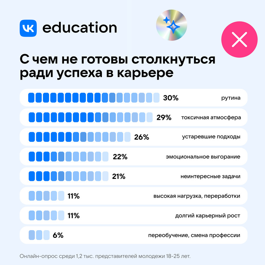 Ради успеха в карьере опрошенные зумеры не готовы сталкиваться с рутиной (30%), токсичной атмосферой (29%), устаревшими подходами (26%), риском эмоционального выгорания (22%) и неинтересными задачами (21%). Немного лольянее они относятся к переработкам и высокой нагрузке, длительному продвижению по карьерной лестнице (по 11%) и необходимости переобучения или смены профессии – 6%.