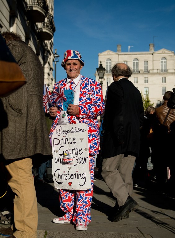 Добавим, что лондонцы вышли поприветствовать свою любимицу Кейт. Роялисты собрались за несколько часов до церемонии в 30 метрах от входа во дворец Святого Джеймса. Многие пришли с подарками и плакатами. Известный фанат-роялист Терри Хатт, например, принёс игрушку для малыша. Терри был в костюме цвета британского флага, который он надевает только в честь самых важных событий. Он следил за свадьбой принца, затем две недели ночевал у больницы святой Марии и, наконец, дождался крещения.
