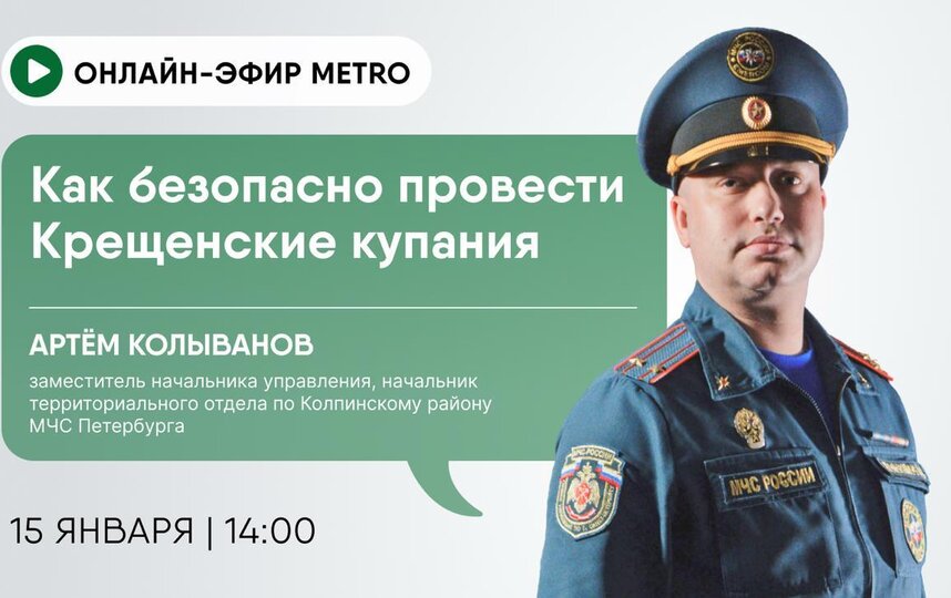 В Крещение Господне петербургские спасатели рекомендуют жителям купаться только в специально оборудованных прорубях. Погружение в ледяную воду – серьёзный стресс для организма, и лучше проводить этот ритуал под присмотром сотрудников МЧС и медиков. Обо всём подробнее расскажет гость нового онлайн-эфира Metro, начальник территориального отдела по Колпинскому району МЧС Петербурга Артём Колыванов.